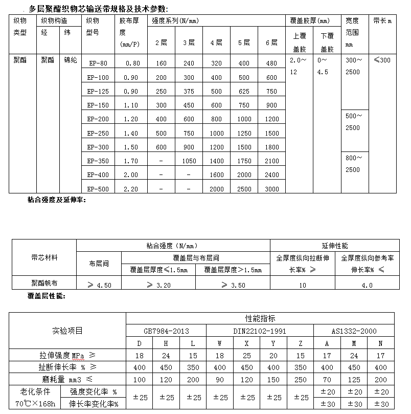 聚酯輸送帶又稱EP輸送帶,其骨架材料為經向滌綸、緯向錦綸交織而成的聚酯帆布,其性能特點是經向的低延伸率和緯向的優良成槽性能,耐水性好,濕態強度不下降,不發生霉變,初始模量高,適用于中長距離較高載重、高速條件下輸送物料。