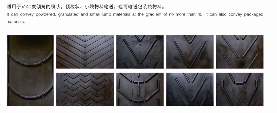 The patterned conveyor belt is composed of a belt body and a patterned part. Due to different transportation materials and conveyor inclination angles, the shape and depth of the patterned belt are required to be different. Suitable for conveying powder, granular, and small materials with an inclination angle of ≤ 40 degrees, as well as packaging bag materials.